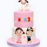 Нежный двухъярусный торт в пастельно-розовых тонах с воздушными рюшами по краям. Верхний ярус украшен изящной надписью, выполненной тонким шрифтом, что придает торту трогательную нотку. Переход между ярусами подчеркнут тонкой золотистой лентой, добавляющей торжественности. Общая композиция выглядит легко и романтично, словно создана для теплого семейного праздника.
