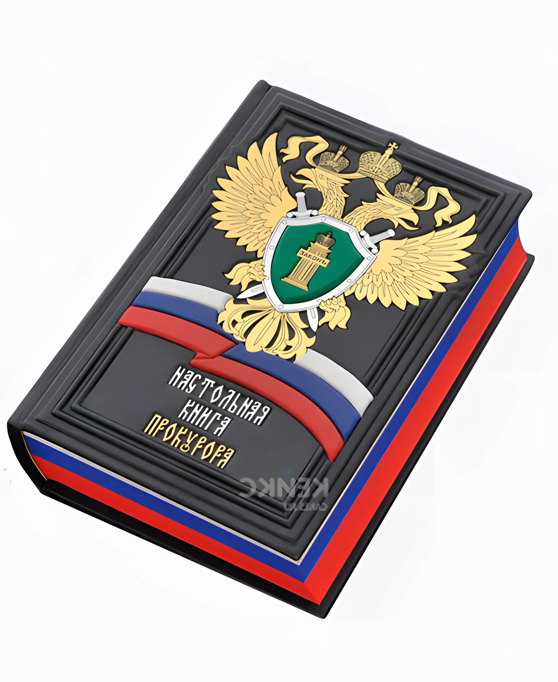 Торт выполнен в виде раскрытой книги с тщательно проработанными деталями. На обложке элегантно смотрятся золотистые узоры и герб, создающие атмосферу официальности и важности. Боковые стороны имитируют страницы с текстурой бумаги, а уголки стилизованы под потёртости. Сдержанная цветовая гамма белого и золотого подчёркивает статусность и элегантность композиции.