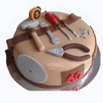 На бежевом фоне изящно расположены миниатюрные металлические детали и инструменты, создающие атмосферу мастерской. Элегантные золотые надписи и тонкие линии придают торту сдержанную техническую эстетику. Каждый элемент композиции словно рассказывает историю ремесла и точности.