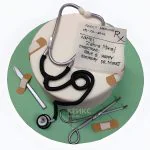 Торт выполнен в медицинской тематике с изящными деталями. На белоснежной поверхности размещены реалистичные элементы: стетоскоп из мастики и пластырь с тонкой прорисовкой. Лаконичная цветовая гамма в белых и серебристых тонах создает ощущение стерильности и профессионализма. Минималистичный дизайн подчеркивает элегантность и точность, характерные для медицинской сферы.