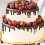 Этот пышный двухъярусный торт идеально подойдет для любого торжества! Он покрыт шоколадной глазурью, сверху украшен свежей клубникой и малиной, а по бокам черникой и ежевикой.