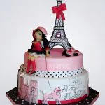 Этот торт — маленький Париж на вашем столе. Нежная Эйфелева башня из шоколада возвышается над гладью белоснежной глазури, словно в лучах утреннего солнца. У её подножия — изящная фигурка девушки с пуделем, создающая трогательную сценку. Пастельные оттенки розового и золотые акценты придают торту лёгкость и романтичное настроение. Каждая деталь продумана до мелочей, превращая десерт в миниатюрное произведение искусства.