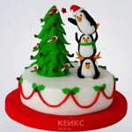 Новогодний торт в виде пушистой ёлочки, украшенной яркими шарами и гирляндой. Вокруг основания расположились забавные пингвины в шарфиках. Сочетание насыщенной зелени мастики и праздничных акцентов создаёт волшебное зимнее настроение. Идеально передаёт атмосферу самого сказочного праздника в году.