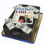 Квадратный торт в роскошном золотом оформлении. На поверхности — стилизованные изображения банкнот и монет, создающие иллюзию настоящего богатства. Сочетание глубоких шоколадных оттенков с позолотой вызывает ощущение роскоши и праздника. Каждый элемент декора тщательно проработан, создавая целостную композицию финансовой тематики.