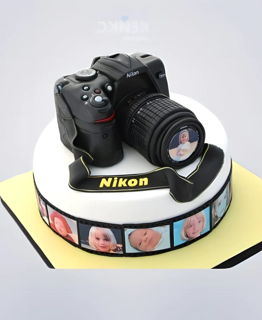 Торт в виде фотоаппарата с детскими фото