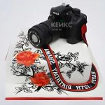 Этот квадратный торт — настоящая миниатюрная художественная галерея! Белоснежная мастика превратилась в холст для изящной росписи с золотыми акцентами. Центральный элемент — объемный фотоаппарат, выполненный с удивительной детализацией. Пастельные оттенки фона создают нежное обрамление для ярких акцентов декора. Каждый элемент будто оживает, приглашая рассмотреть тонкую работу мастера. Торт напоминает драгоценную шкатулку, где каждый завиток и линия продуманы до мелочей.