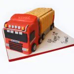 Яркий торт в виде грузовика сразу привлекает внимание своей необычной формой. Сочно-оранжевый тягач с детализированными элементами создает эффект настоящей фуры. Черные колеса, фары, зеркала и решетка радиатора добавляют реалистичности композиции.