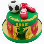 Этот торт — настоящий праздник для фанатов футбола! Он выполнен в виде мяча с узнаваемыми черно-белыми шестиугольниками, которые создают эффект объемной фактуры. Глянцевая мастика придает торту стильный и современный вид, а аккуратные стыки между деталями подчеркивают мастерство исполнения. Яркий зелёный фон напоминает футбольное поле, добавляя динамики и завершая спортивную тематику. Такой торт станет эффектным украшением любого мероприятия, связанного с любимой игрой.