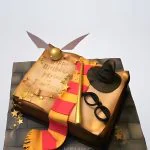 Этот удивительный торт выполнен в виде раскрытой книги из вселенной Гарри Поттера. На одной стороне — страницы с золотым тиснением, на другой — объемная шляпа и очки, как у знаменитого волшебника. Торт украшен мелкими деталями, включая магические символы и узоры, создающие атмосферу Хогвартса. Идеальный подарок для поклонников саги!