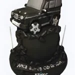 Этот торт вдохновлен культовым внедорожником — его форма и детали точно передают брутальный облик Geländewagen. Матово-серая мастика имитирует металлический корпус, а черные акценты подчеркивают решетку радиатора и колесные диски. Минималистичный дизайн с четкими линиями создает эффект реалистичности, будто перед вами уменьшенная копия автомобиля. Сдержанная цветовая гамма и внимание к деталям делают этот торт стильным и запоминающимся.