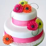 Нежный двухъярусный торт, словно окутанный летним настроением. Нижний ярус — мягкий персиковый, верхний — нежно-розовый, создавая лёгкий градиент. Крупные герберы с тонкими лепестками будто только что сорваны с поляны, их сочные оранжевые и розовые оттенки добавляют торту жизнерадостности. Матовая мастика придаёт торту утончённость, а зелёные листья среди цветов напоминают о свежести летнего утра. Простота линий и натуральность декора делают этот торт тёплым и душевным.