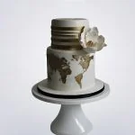 Этот элегантный одноярусный торт выполнен в виде стилизованного глобуса с тонкими золотыми линиями, имитирующими меридианы. Белоснежная глазурь создаёт эффект хрупкого фарфора, а золотые акценты придают торту роскошный блеск. В центре композиции — нежный белый цветок с золотистой сердцевиной, напоминающий изысканную брошь. Сочетание матовой белой поверхности и мерцающего золота вызывает ассоциации с классической эстетикой и утончённым стилем.