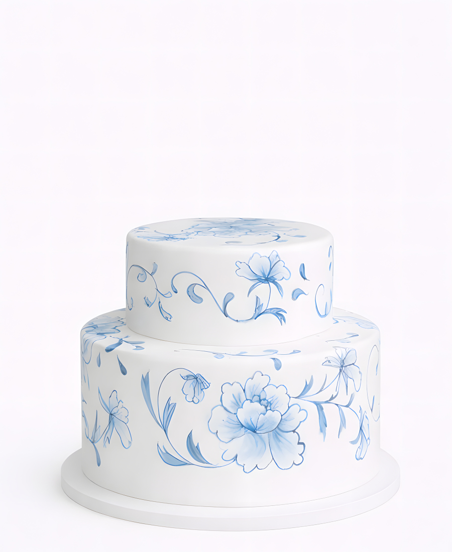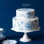 Этот торт в стиле гжель – настоящее произведение искусства. Два яруса, покрытые гладкой мастикой, украшены изящными сине-белыми узорами, напоминающими традиционную русскую роспись. Чистые линии и лаконичный дизайн создают ощущение легкости и воздушности. Синие завитки и цветочные мотивы на белоснежном фоне выглядят одновременно просто и изысканно. Торт словно сошел с музейной витрины, сохраняя дух старинного промысла в современном исполнении.