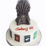 Этот торт – настоящий подарок для фанатов «Игры престолов»! На темно-синей мастике эффектно смотрится золотистая фотопечать с символикой сериала – гербами великих домов Вестероса. В центре – стильная надпись, выполненная изящным шрифтом, напоминающим средневековые манускрипты. Благородная цветовая гамма в сочетании с глубоким синим и золотом создает атмосферу королевской роскоши. Торт выглядит как артефакт из самого Вестероса, словно его привезли прямо с турнира в Королевской Гавани.