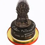 Величественный черный торт в стиле «Игры престолов» поражает своей монументальностью. На вершине возвышается детализированный трон из мастики, украшенный искусной резьбой. Глубокий черный цвет создает атмосферу таинственности и власти, а золотистые акценты на троне добавляют торжественности. Каждый элемент композиции словно рассказывает историю о борьбе за железный трон, перенося в мир Вестероса.