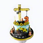 На ярко-голубом фоне мастики оживает строительная площадка: желтый подъемный кран, разноцветные машинки и аккуратные дорожки из шоколадной крошки. Каждая деталь проработана с любовью, создавая динамичную и реалистичную композицию. Этот торт словно переносит в мир детских игр и больших приключений.