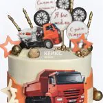 На ярком круглом торте изображен мощный Камаз, который везет целую гору разноцветных конфет и сладостей. Фотопечать создает эффект объемного изображения, словно это настоящая машина с вкусным грузом. Яркая цветовая гамма и динамичная композиция вызывают детский восторг и ощущение праздника. Такой торт станет центром внимания на любом мероприятии, особенно порадует любителей техники и сладкоежек.
