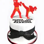 На торте изображен маленький каратист в белом кимоно, замерший в эффектной боевой стойке. Фон украшен яркими красными и черными полосами, создающими динамичный контраст. По бокам размещены стилизованные иероглифы, добавляющие восточного колорита. Композиция передает энергию движения и дух боевых искусств через лаконичную, но выразительную визуальную историю.