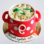 Невероятно оригинальный торт в виде уютной кастрюли! Боковая поверхность имитирует металлическую текстуру с ручками, а сверху — аппетитные пельмени, аккуратно выложенные по кругу. Яркая цифра добавляет праздничного настроения. Цветовая гамма в теплых бежевых и золотистых тонах создает ощущение домашнего уюта и веселья. Такой торт непременно вызовет восторг и улыбки гостей своей необычной концепцией!