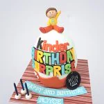 Этот яркий 3D-торт в виде огромного Киндер-сюрприза мгновенно привлекает внимание. Гладкая мастика шоколадного цвета с узнаваемой красно-белой этикеткой выглядит как настоящая обёртка любимого лакомства. Жёлтый бантик добавляет торту игривости и динамики. Иллюзия только что распакованного сюрприза создаёт ощущение праздника и детского восторга. Контрастные цвета и чёткие линии делают торт эффектным центром любого мероприятия.
