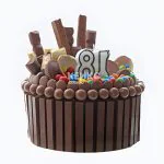 Элегантный круглый торт в нежной бежево-золотой гамме. Поверхность украшена изящными геометрическими узорами, создающими эффект мягкого мерцания. Золотистые шоколадные плитки и яркие киндер-сюрпризы добавляют праздничный акцент, напоминая о детской радости и волшебстве. Композиция выглядит современно и утонченно, словно драгоценный подарок в мягком свете.