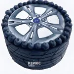 Круглый торт в виде стилизованного колеса покрыт нежной голубой мастикой. По краю расположены аккуратные спицы из белого шоколада, создающие эффект движения. Сверху — россыпь свежей голубики, добавляющая сочные фиолетовые акценты. Лаконичный дизайн передает ощущение летней легкости и природной гармонии.
