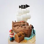 Этот торт переносит в мир морских приключений! На белоснежной поверхности, напоминающей паруса, расположился забавный пират с ярко-красной банданой. Рядом – деревянный сундук с золотыми деталями, будто только что поднятый со дна. Синие волны из крема обрамляют основание, создавая ощущение движения. Шоколадные дощечки имитируют палубу корабля. Каждая деталь проработана с любовью к пиратской романтике.