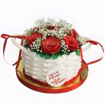 Этот торт — настоящая цветочная корзина, воплощенная в сладком формате. Нежные розовые и белые цветы, переплетаясь с зелеными листьями, создают ощущение свежести и легкости. Гладкая мастика имитирует плетеную корзину, добавляя натуралистичности композиции. Сдержанная цветовая гамма и изящные детали делают его трогательным и романтичным. Такой торт словно несет в себе тепло и заботу, превращаясь в маленький съедобный букет.