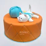 Оранжевый торт с фигуркой белого кота и нитками