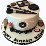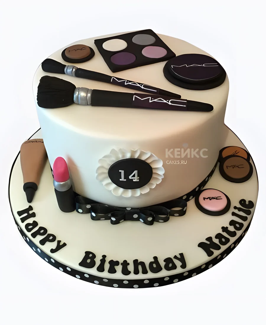 Белый торт с черной надписью и косметикой