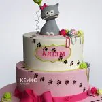 Нежный розовый торт с очаровательным серым котенком на вершине. Гладкая матовая поверхность украшена изящными деталями в пастельных тонах. Фигурка котенка, выполненная из мастики, придает торту трогательный и милый вид. Идеальный вариант для тех, кто ценит элегантность и уют в десертах.