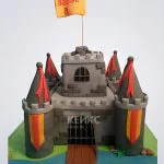 Этот торт — настоящая миниатюрная крепость, выполненная с удивительной детализацией. Два квадратных яруса покрыты мастикой, имитирующей каменную кладку с фактурными швами. На верхнем ярусе гордо развевается флаг, добавляя динамики композиции. Серо-бежевая гамма создает ощущение монументальности, а аккуратные зубцы по краям напоминают о средневековых замках. Такой торт словно переносит в мир рыцарских турниров и сказочных приключений, где каждый кусочек — шаг в увлекательную историю.