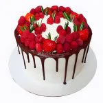Белоснежный торт с алыми ягодами создаёт элегантный контраст. Шоколадные акценты добавляют торжественности композиции. Чистые линии и лаконичный декор подчёркивают изысканность формы. Яркие ягоды словно драгоценные камни на фоне идеально гладкой поверхности.