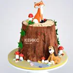 Этот очаровательный торт выполнен в виде лесного пенька с мухоморами. Круглая форма торта покрыта гладкой мастикой, имитирующей текстуру древесной коры. Декор включает фигурки ярких мухоморов с белыми точками, которые придают торту сказочный вид. Одноярусная конструкция выглядит аккуратно и гармонично, идеально подходя для тематического праздника или детского дня рождения.