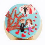 Нежный голубой торт с романтичным сюжетом: на белоснежной веточке сидят два влюбленных персонажа, чьи силуэты выполнены в лаконичном стиле. Фон украшен тонкими линиями, имитирующими движение ветра, что создает ощущение легкости и воздушности. Пастельные оттенки голубого и белого придают торту трогательную нежность, а минималистичный декор делает его элегантным и стильным.