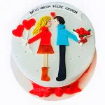 Нежный круглый торт, словно страница из романтической истории. Белоснежная мастика создает чистый фон, на котором оживает трогательная сцена: две фигурки влюбленных, склонившихся друг к другу. Красные акценты в виде сердечек добавляют ярких эмоций, а изящные золотые детали придают торту нарядный блеск. Простота форм сочетается с теплотой сюжета, делая этот десерт визуальным признанием в чувствах.