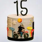 Этот торт — настоящий праздник скорости и приключений! На круглой мастичной основе разворачивается динамичная сцена: парень на мотоцикле мчится по дороге, оставляя за собой вихрь эмоций. Яркие акценты синего, красного и черного создают контраст, подчеркивая энергию движения. Детали проработаны с любовью: колеса, фары, даже складки на одежде — все выглядит по-настоящему. Торт словно застывший кадр из захватывающего мультфильма, который хочется рассмотреть со всех сторон.