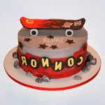 Этот яркий торт сразу привлекает внимание сочной оранжевой палитрой и динамичным дизайном. Центральный элемент — стильный скейтборд с детализированными колесами, выполненный из мастики. Черные и белые акценты создают эффектный контраст с основным цветом. По бокам — графичные полосы, напоминающие траекторию движения, что добавляет торту ощущение скорости и энергии. Простые, но выразительные детали делают его отличным вариантом для тематического праздника.