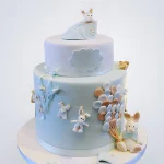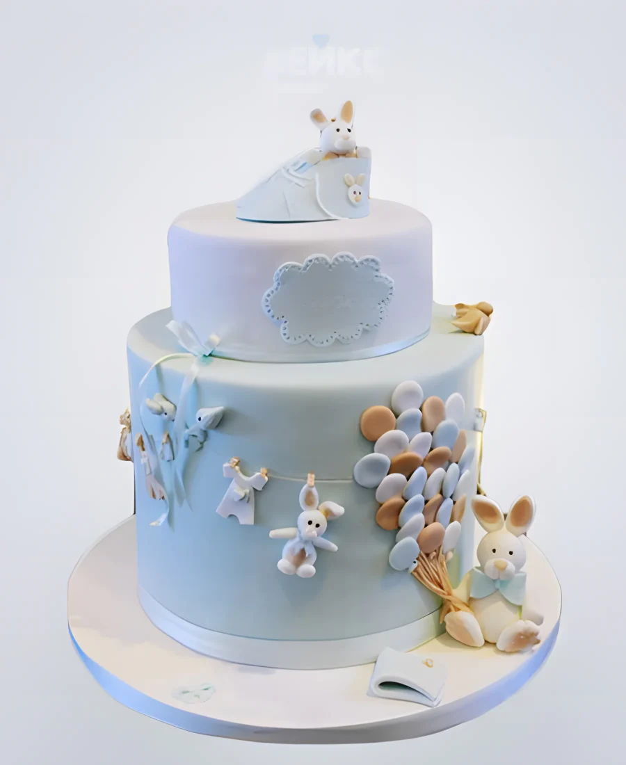 Торт голубого цвета с зайцами и шарами