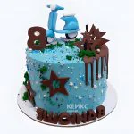 Яркий праздничный торт в сине-голубой гамме с динамичным сюжетом. На переднем плане — стильный красный скутер, окруженный воздушными белыми облаками. В центре композиции выделяется объемная цифра восемь, украшенная контрастными голубыми и белыми полосами. Фон создает ощущение движения и скорости, словно скутер мчится по праздничной трассе. Сочетание насыщенных цветов и четких линий передает энергию и радость особенного дня.