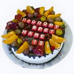 Нежный круглый торт в пастельных тонах украшен тонкими дольками апельсина, создающими солнечный акцент. Белоснежная глазурь покрыта изящными завитками и жемчужным кантом. Трогательная надпись «Маме» добавляет особую теплоту и личное обращение. Сочетание кремовых оттенков и ярких цитрусовых создает гармоничную композицию, наполненную светом и нежностью.