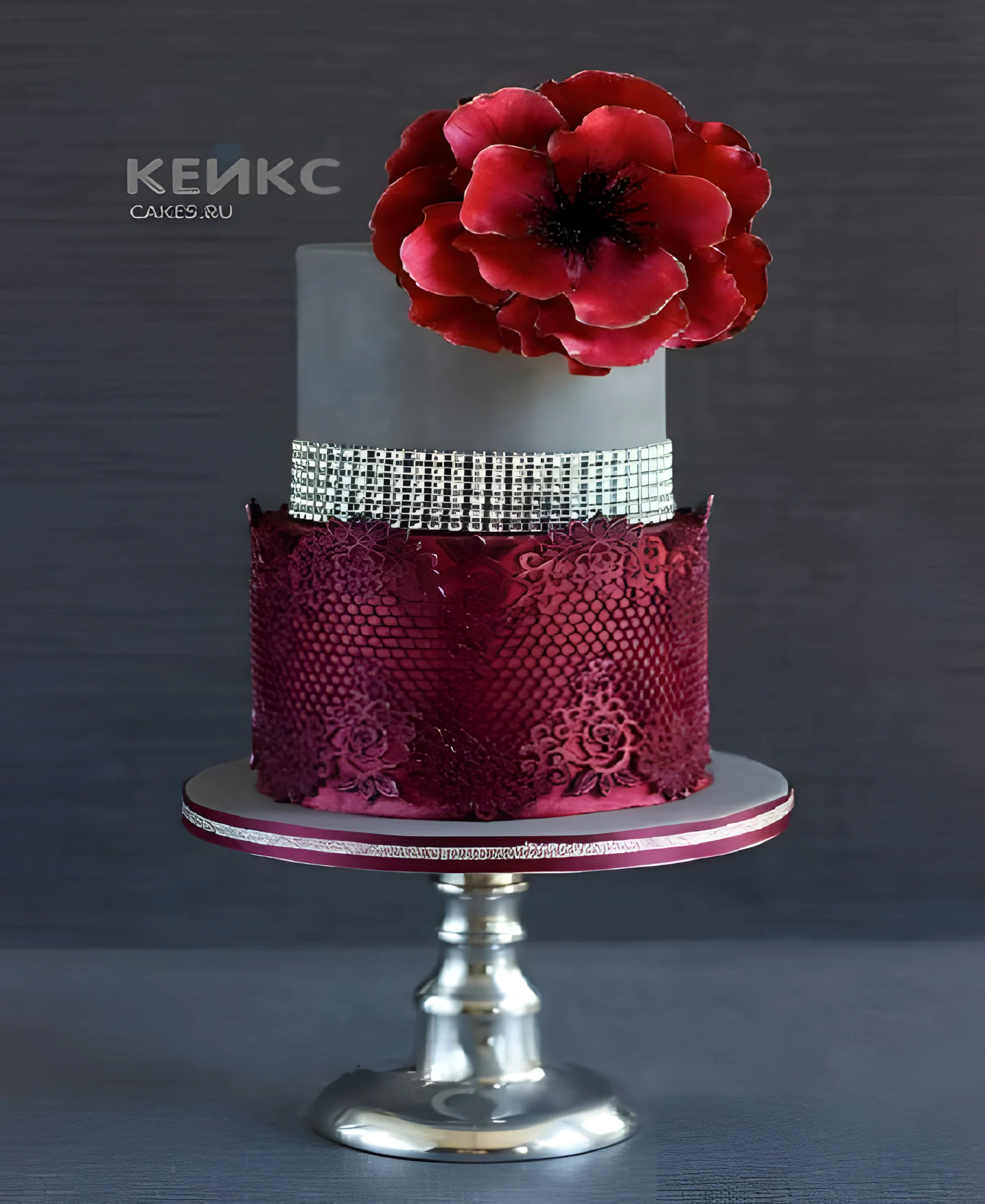 Двухъярусный серо-бордовый торт с цветком
