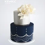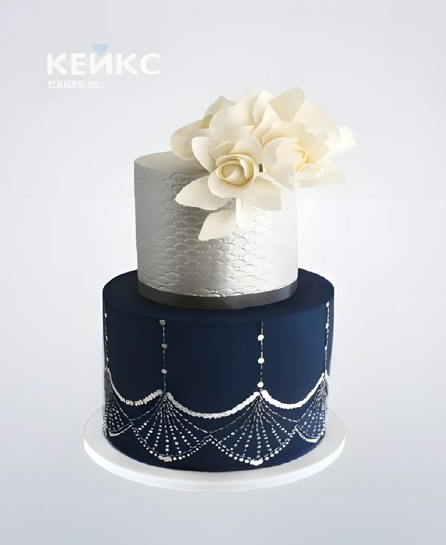 Бело-синий двухъярусный торт с узорами и цветами