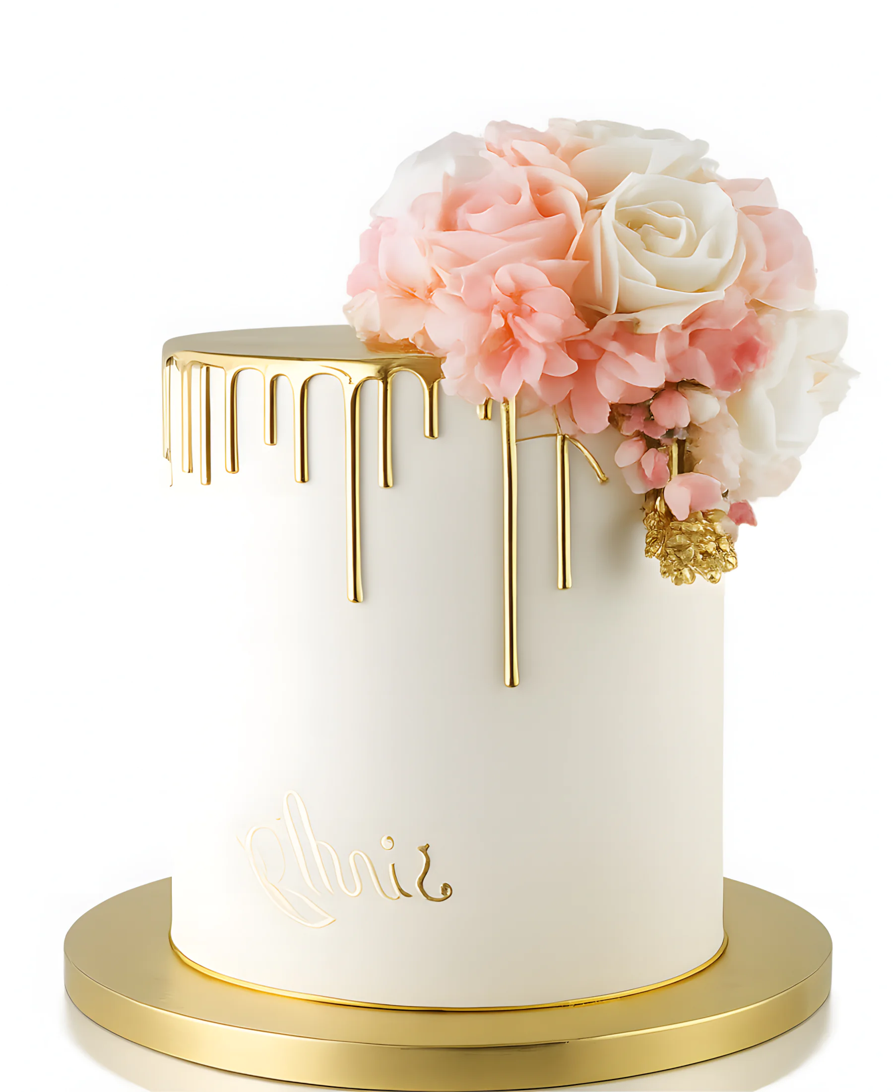 Маленький свадебный торт с золотой глазурью и букетом цветов