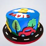 Этот яркий круглый торт создан для праздника двухлетнего малыша! Мастика насыщенного синего цвета напоминает дорожное полотно, а аппликация в виде забавной машинки сразу привлекает внимание. Контрастные белые линии имитируют разметку, добавляя динамики. Простые, но выразительные детали — фары, колеса, улыбка на капоте — вызывают улыбку и создают игривое настроение. Лаконичный и понятный малышу дизайн превращает торт в центр внимания на детском празднике.