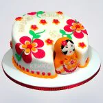 Нежный круглый торт в пастельных тонах украшен изящной аппликацией. На белоснежном фоне расположилась очаровательная матрешка в розовом платочке, окруженная цветочными композициями. Сочетание нежно-розового, голубого и зеленого создает весеннее настроение. Каждый элемент декора выполнен с трогательной аккуратностью, напоминая страницы из детской книжки со сказками.