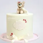 Этот очаровательный круглый торт украшен белой мастикой с нежными розовыми акцентами. Главный элемент декора — фигурка милого медвежонка, который держит в лапках маленькое сердечко. Дополнительные детали — бантик и рассыпанные по поверхности торта миниатюрные сердечки, создающие романтичное настроение. Простой одноярусный дизайн делает торт идеальным для детского праздника или милого свидания.