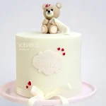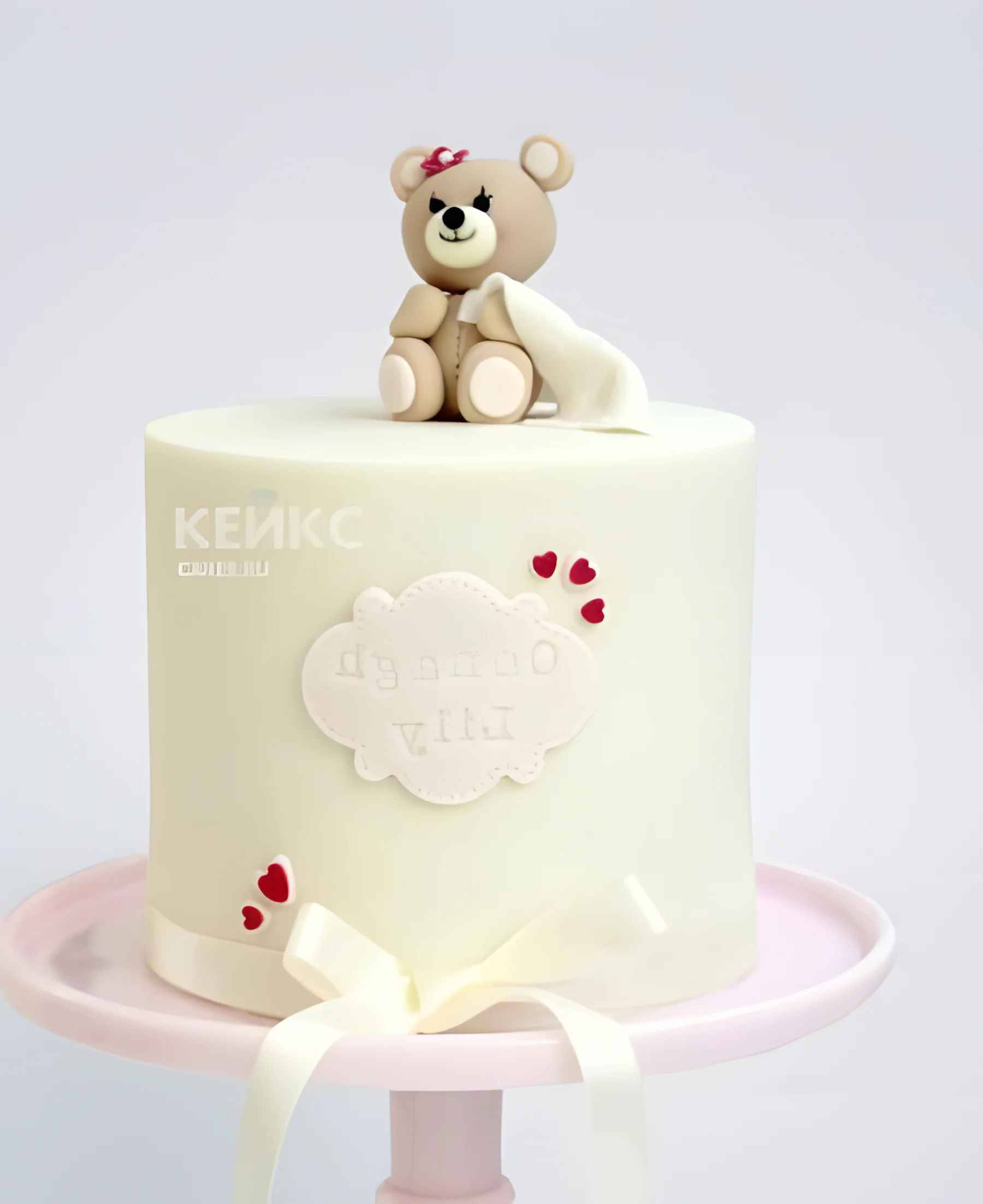 Этот очаровательный круглый торт украшен белой мастикой с нежными розовыми акцентами. Главный элемент декора — фигурка милого медвежонка, который держит в лапках маленькое сердечко. Дополнительные детали — бантик и рассыпанные по поверхности торта миниатюрные сердечки, создающие романтичное настроение. Простой одноярусный дизайн делает торт идеальным для детского праздника или милого свидания.