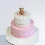 Этот нежный торт выполнен в бело-розовой палитре с акцентной фигуркой медведя. Одноярусный десерт украшен гладкой мастикой, которая придает ему элегантный и лаконичный вид. Розовые акценты гармонично дополняют белую основу, создавая романтичное настроение. Фигурка медведя добавляет торту милый и трогательный штрих, делая его идеальным для детского праздника или нежного торжества.