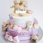 Нежный круглый торт в пастельно-розовых тонах украшен очаровательной композицией из фигурок медвежьей семьи. Гладкая матовая глазурь создает элегантную основу, на которой расположились мишки разного размера. Торт выглядит очень уютно и по-домашнему, идеально подходя для семейного праздника. Простой одноярусный дизайн делает его универсальным вариантом для любого торжества.